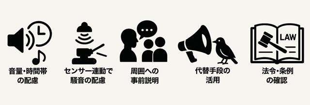 音による対策では、効果と周囲への配慮の両立が重要です。大音量で追い払えても、毎晩鳴れば騒音トラブルになります。住宅地や深夜・早朝の運用は特に慎重に計画します。